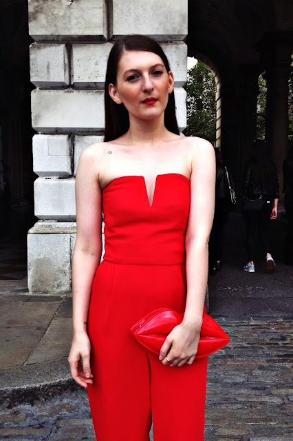 There's only few days left till London Fashion Week starts again and the madness that surrounds it. Before that happens I still have two outfits to show you from last year's LFW in September. Everytime I wear this jumpsuit I feel like I need to add more red into my wardrobe. There's nothing sexier than a bit of red lipstick and red heels even if you're only wearing a pair of jeans and a T-shirt, but wearing all red is taking things to another level. You can see I pretty much went all out with this look even matching my clutch bag, phone case and ring - all red and lips shaped.